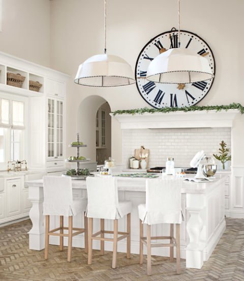 A single garland lends a splash of color in the all white kitchen of this Arizona home.